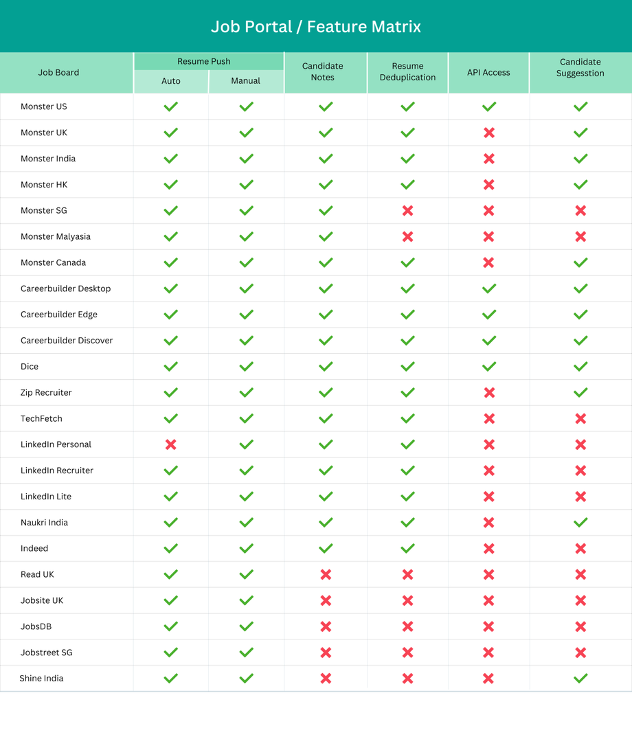 The table below gives the features of Recruitment Assist that are supported on various job boards.